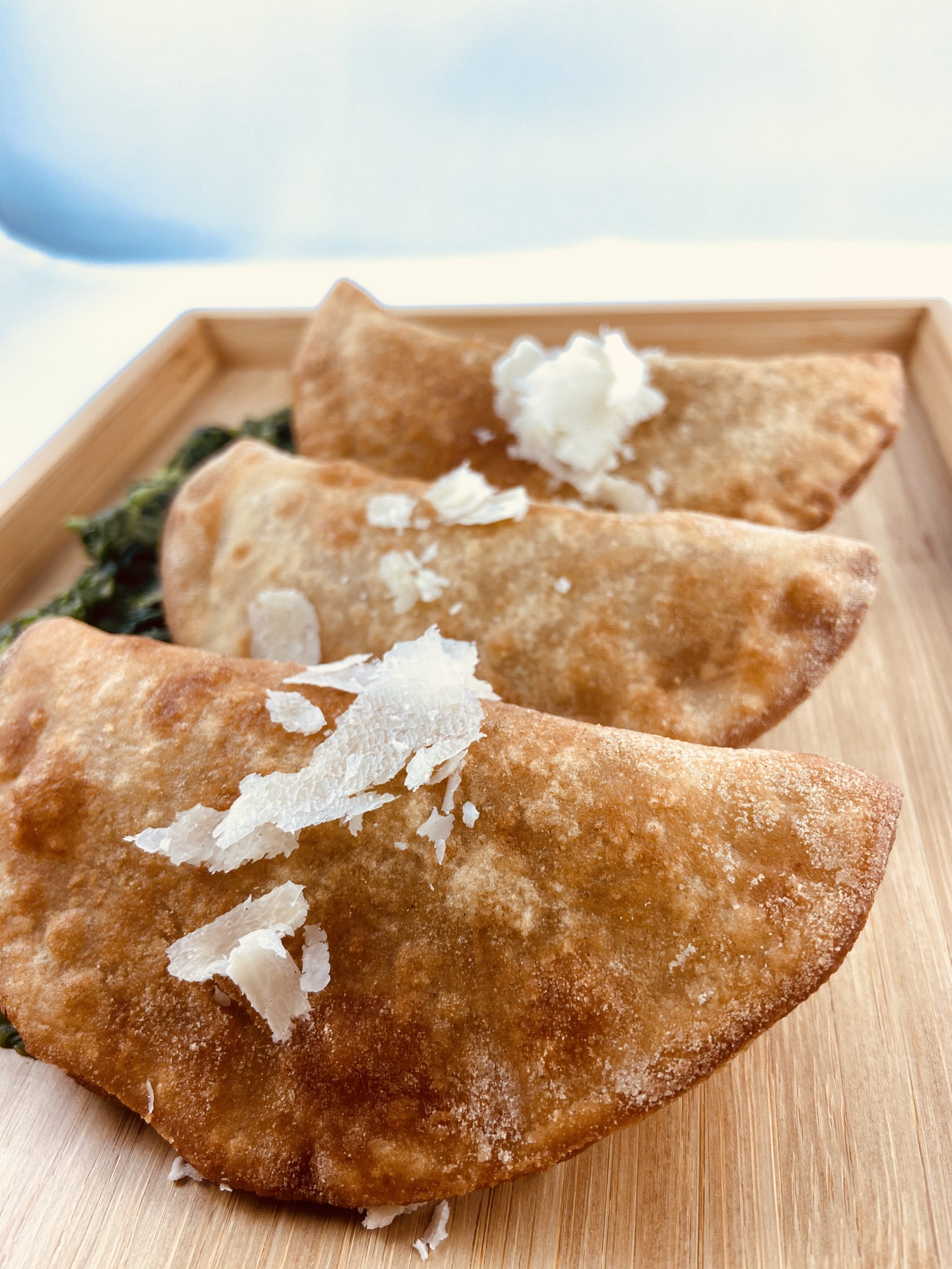 Hausgemachte Käsekrapfen. Aus Roggen und Dinkelmehl, Butter, Wasser, Salz. Die Fülle besteht aus Topfen, mildem Käse, Kräutern, Kräutersalz, Pfeffer. Auf Salat mit Joghurtdressing ein kulinarischer Hochgenuss. (Vorgebacken, vegetarisch!)